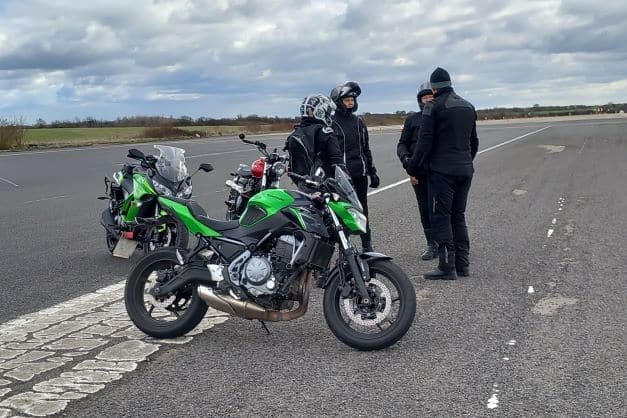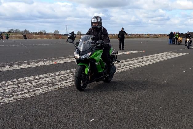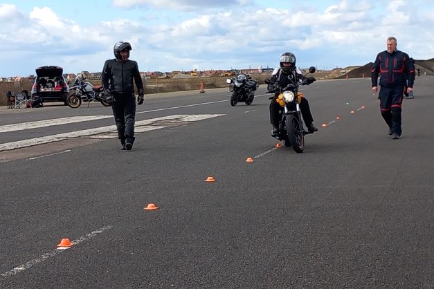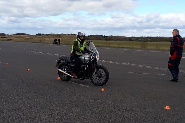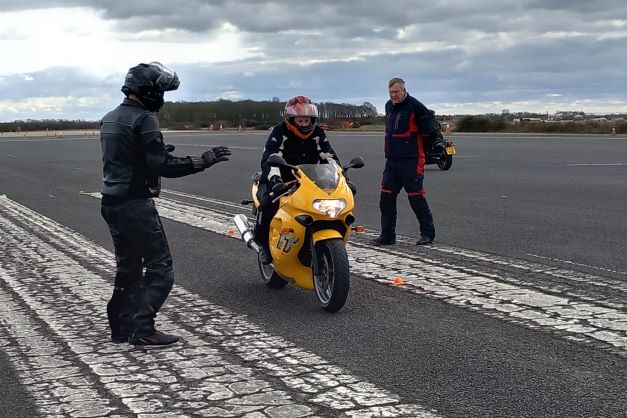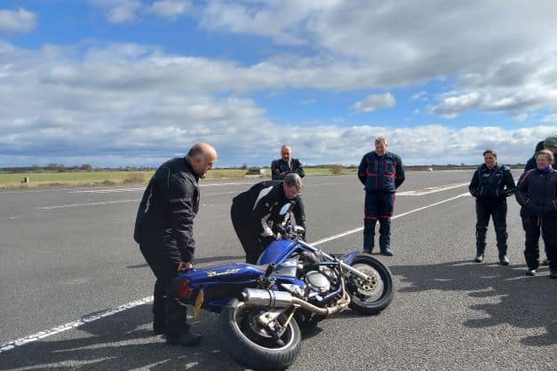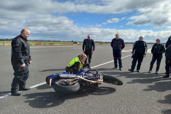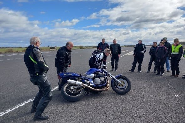 The session took place at Alconbury Airfield with PECAM Members exercises, including U-turns, slow riding, slalom and figure of 8, as well as high speed braking and manual handling and the chance to practice picking up a dropped bike, using the PECAM bike.